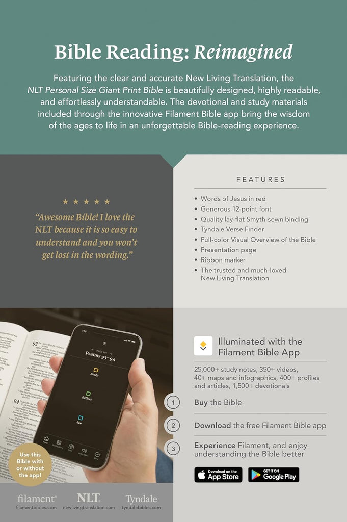 The Tyndale NLT Personal Size Giant Print Bible, Filament Enabled has readable text and an attractive layout in an easy-to-carry size. And while it has the same low price as basic text-only Bibles, the NLT Personal Size Giant Print Bible offers much more. It not only features a bold new design and the trusted and much-loved New Living Translation (NLT) but also includes the groundbreaking Filament Bible app.